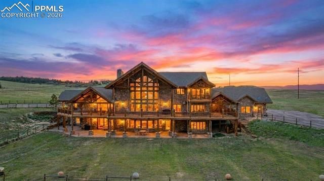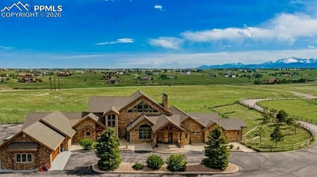 Set on 35 acres of pristine Colorado landscape, this exceptional ranch estate with a loft offers 4 bedrooms, 6 bathrooms, and an unmatched blend of privacy, luxury, and panoramic views of the valley and Pikes Peak. Every inch of this home reflects thoughtful design and timeless craftsmanship. The breathtaking great room features a 29-foot vaulted ceiling with exposed timber beams, a wall of windows that floods the space with natural light, rich hardwood flooring, elegant chandeliers, and a dramatic stone-wrapped fireplace. The gourmet kitchen is a chef’s dream with slab granite countertops, custom cabinetry, dual oversized islands—one with a gas cooktop and antler chandelier, the other with a prep sink and bar seating—plus a cozy breakfast nook and walk-in pantry. A formal dining room with vaulted wood ceilings and hardwood floors sets the stage for memorable gatherings. The main-level primary suite is a luxurious retreat with a fireplace, vaulted wood ceiling, and access to a wrap-around covered deck. The spa-inspired en-suite bath features a massive walk-in steam shower, soaking tub, dual vanities, and two walk-in closets—one with its own washer and dryer. Downstairs, the finished walk-out lower level includes a spacious family room with wet bar and fireplace, an authentic in-home theater, and two additional en-suite bedrooms. Outdoors, enjoy a fenced backyard, fenced pasture, and a 3,500+ sq ft barn with 3 stalls and 10 doors—perfect for horses or hobby livestock. This is Colorado living at its finest—where beauty, privacy, and sophistication converge. It’s more than a home—it’s a legacy. Conveniently located just 6 minutes from I-25!